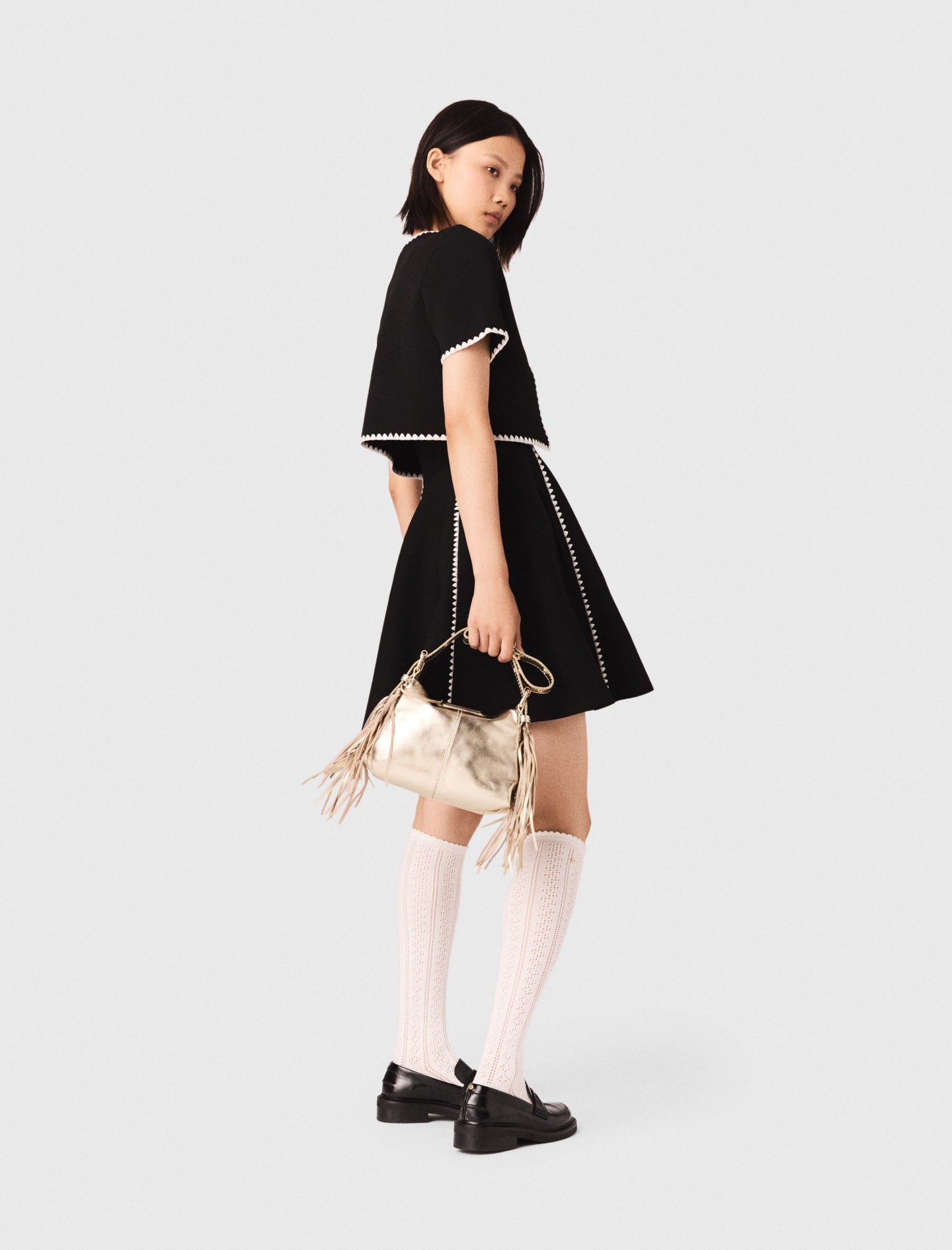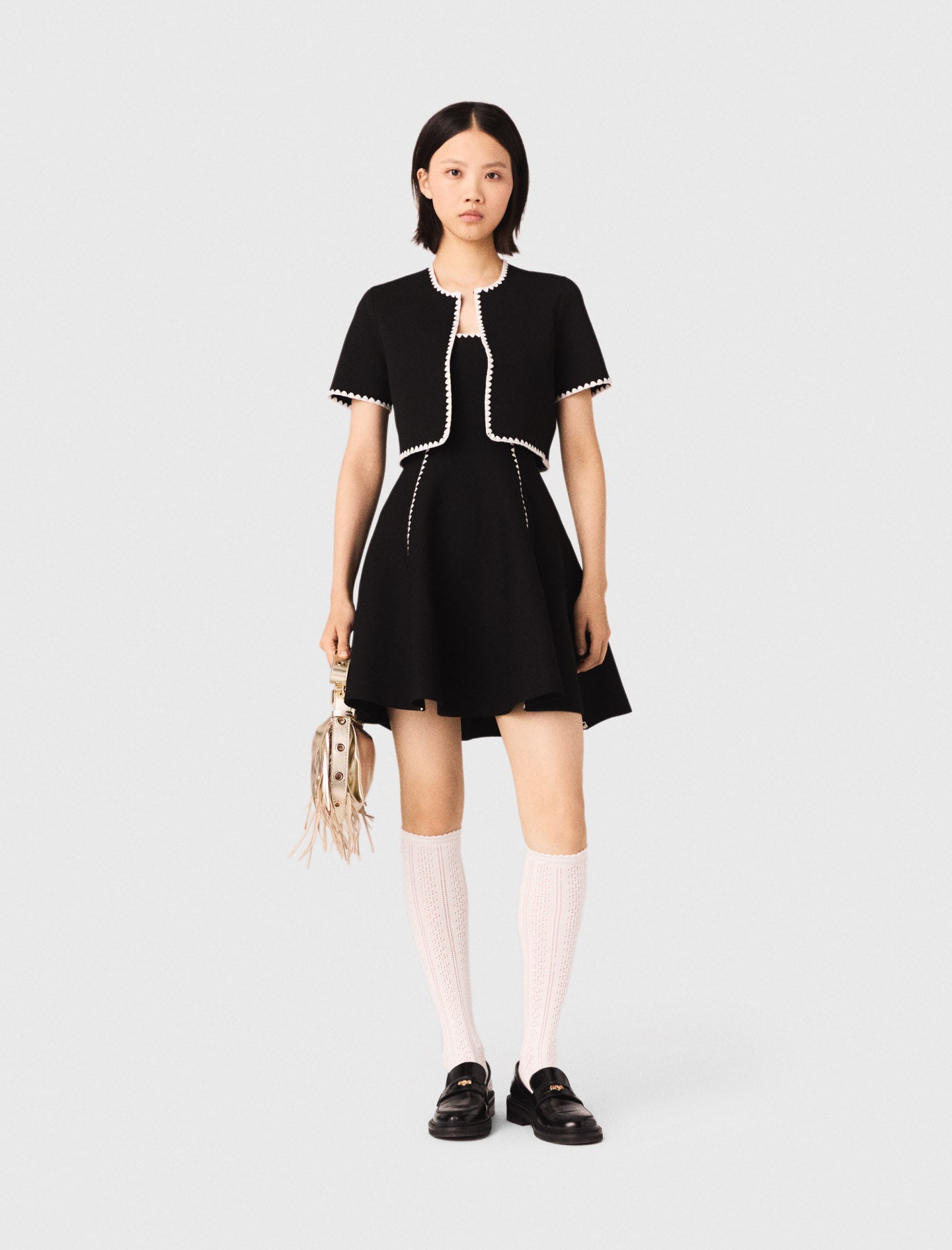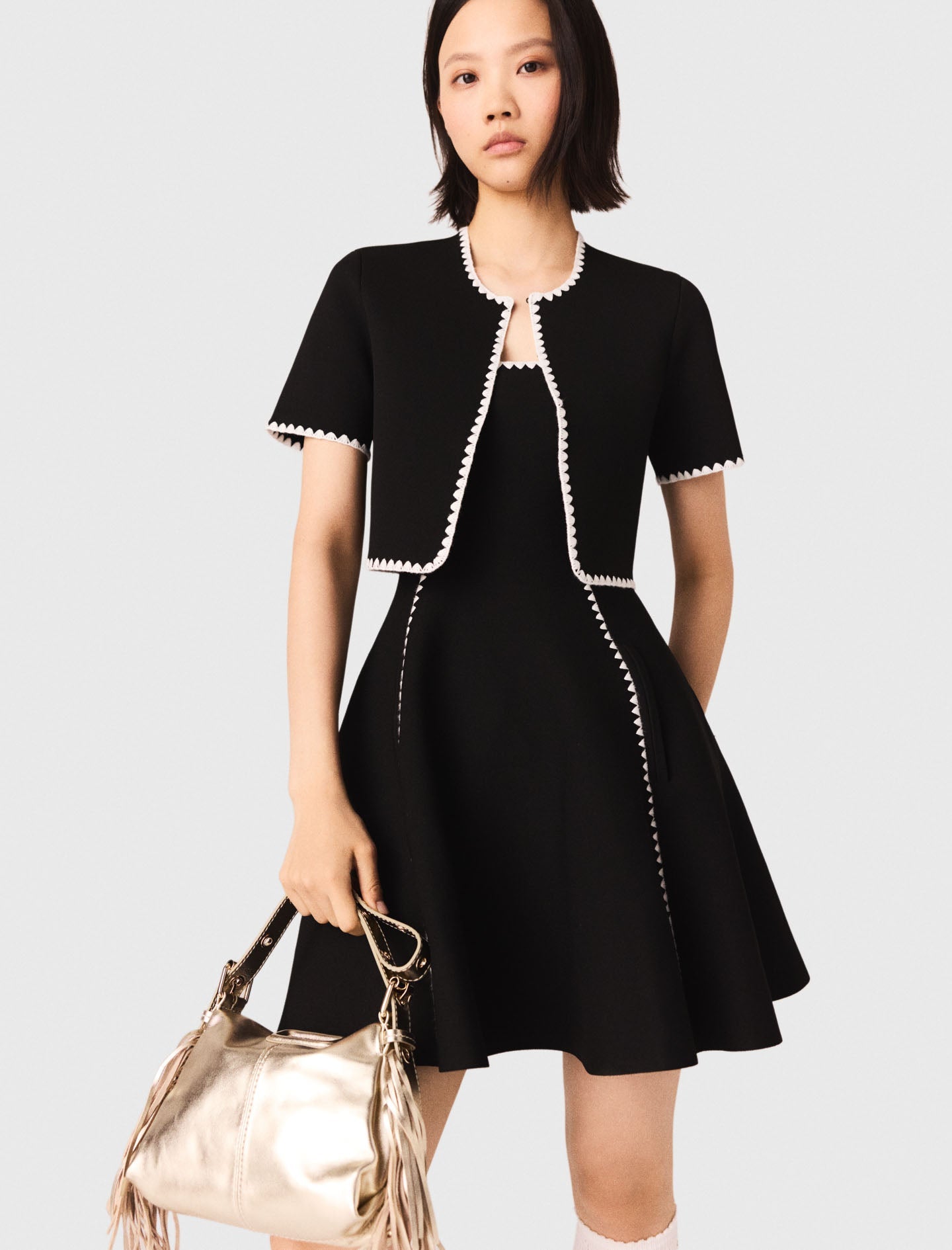 This piece plays on contrasts with its white scalloped trim accentuating every edge, its short sleeves and its cropped fit. Wear it open or closed for an assertive, contemporary look.