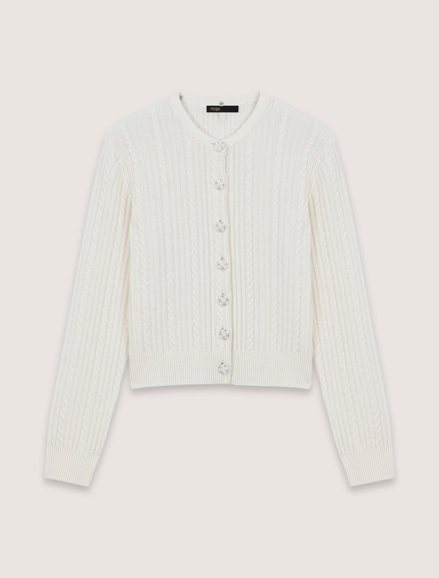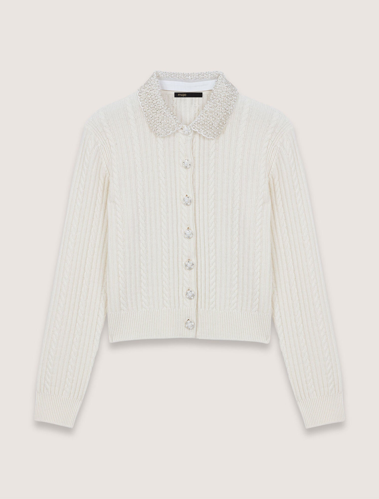 The Maje studio revisits timeless wardrobe pieces in a pastel palette, punctuated with bold details. Made of soft, twisted knit, this cardigan shapes a fitted silhouette. The removable Peter Pan collar is adorned with embroidered pearls and rhinestones. To preserve all the beauty of the details on this piece, the collar is lined and should not be machine washed. Wear it with pearl-embellished jeans and heels for a daring look.